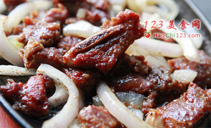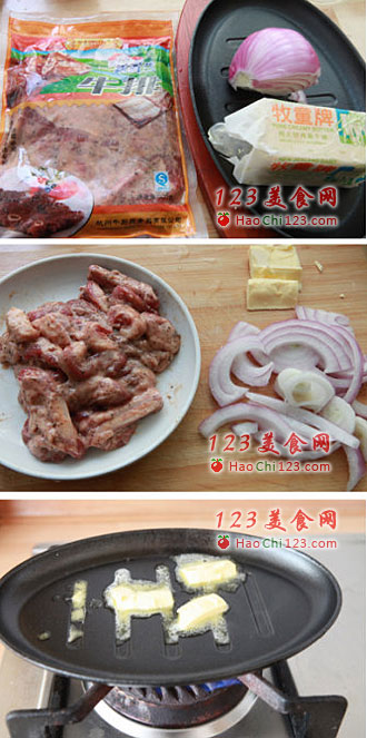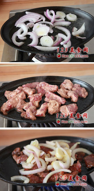 2、将洋葱先放入铁盘中炒香,捞出备用;继续加热铁盘,均匀的铺上牛仔骨,中小火两面各煎3分钟左右至熟,放入酱汁最后加入洋葱一起翻炒均匀即可。