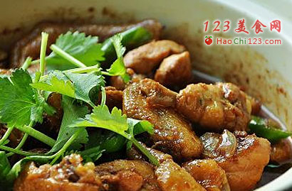 12、焖15分钟左右,开盖,翻动,加入青椒段,再煮2分钟即可。整个炒制过程不要用大火,忌急火猛烧,防砂锅炸裂。锅中不加水,也不用担心鸡会糊锅,鸡肉会煮出自身水份,和调料煮出滋味汤汁。