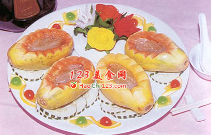 4、取木瓜,平放切去顶部四分之一,余下四分之三木瓜挖去瓜瓤,在切口雕上花纹,刻成木船模样,把炖好的鱼翅调好味道放入木船中,再入蒸笼炖约10分钟至木瓜飘香即可。