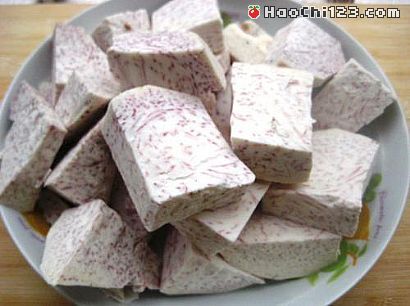 2、香芋去皮切块(很喜欢香芋的花纹,一看就是粉芋)。
