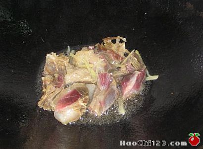 4、把淖过水的腊鸭,倒进锅里翻炒。