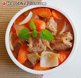 贴士:牛肉里的结缔组织较多,先大块煮再改小块的做法能尽量减少牛肉缩的程度,使口感较嫩;炒洋葱、胡萝卜时要少放些油,因为沙茶酱里也有油。