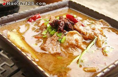 6、先将砂锅用温水涮一下,以免突然倒入热的东西,砂锅爆裂,将牛腩连汤带水的移入砂锅中。