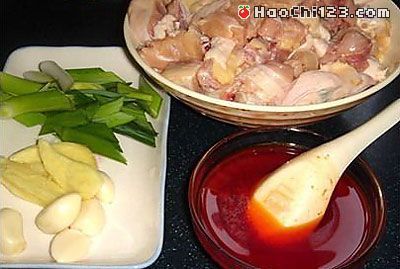 1、鸡洗净斩件沥干水分,蒜去皮,姜去皮拍烂,蒜苗斜切段。