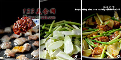 8、9、下入儿菜和蒜苔,转大火翻炒均匀后继续炒2-3分钟即可。因为豆瓣酱有咸度,所以不要加盐了。