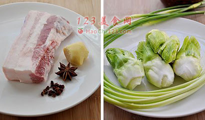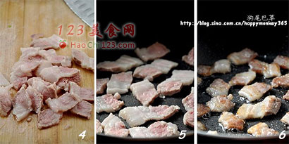5、6、将五花肉片码入锅中,小火煎,将肉的油逼出来,煎至肉两面金黄即可。
