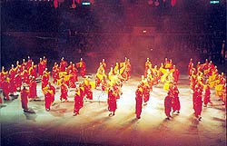 和尚”顶灯又叫“百佛”顶灯。是三门峡黄河风情表演中的一个“绝活”。表演者是三门峡市湖滨区向阳村的一百名普通老百姓。表演时,一百名“和尚”身披袈裟,头顶碗灯,手摇芭蕉扇,脚踏梅花步,在行进中以不同的队形变换不同的花样和图案。动中有静,静中有动。表演者那虔诚、滑稽的神态、表情足以让观赏者充分领略到那一份“佛法无边”的无穷魅力。表演主要靠眼力、颈力,自始至终讲究一个“稳”字。以高、难、险著称。其实这种表演来自一个传说。相传,东汉时,有一位高僧奉旨到京都洛阳讲学,途经陕州时,各寺方丈、主持都跪道迎留讲经。因那高僧学识渊博,讲的听者是如痴如醉,这便引得那欲罢不能,一直待到京都复旨来催,众人这才如梦方醒。因怕误了事,众僧人便赶忙连夜送高僧入京,谁知此时却将老百姓引将出来。众僧阵脚大乱,一时不知所措,这是,只见一和尚,从灯笼中取出灯碗来,放在自己的头上顶着,双手合十向着众百姓,口中念着“阿弥陀佛”,众僧也赶忙效仿,就连那高僧也连连口称“善哉,善哉!”。原来佛教有一个规矩,僧人遇见俗人便要行双手合十礼,否则为犯戒。可是,当时众僧们都提着灯笼,要不是那个机灵和尚想出这个既能照明,又能腾出双手的招数来,恐怕后果就很难估计了。为了感念这位小和尚,每逢正月,陕州城内的僧人们都要头顶碗灯讲经,以光大佛门。顶灯“绝活”就这样流传了下来。现在,向阳村的老百姓在元宵节前后经常表演玩耍。