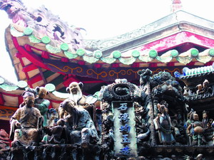 祖庙其实有很多很有特色的雕刻艺术,在北方一般是以木刻为主,但是在南方天气潮湿,木雕很容易腐朽,所以砖刻和石雕在这边的建筑物上还是很常见的。特别是站在脊梁上栩栩如生的石湾公仔,更是让人感觉到当地高超的工艺技术水品。这种装有琉璃花饰瓦的脊梁,当地称为“花脊”,脊上的陶艺人物,当地通常叫“瓦脊公仔”。观赏瓦脊公仔都是从下向上望,因而脊上的人像塑造被巧妙地进行了调整,体态适当前倾,并将头部比例适当加大,把“远小近大”“高小低大”所造成的“头小脚大”的透视错觉矫正。现在祖庙屋檐上的“瓦脊公仔”很多都是清代的作品,他们高高在上已经有上百年,却也经历了百年的风吹雨打。