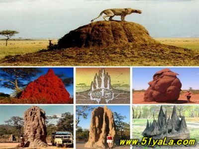 白蚁是一种令人惊叹的动物。蚁后比普通的兵蚁和工蚁大30倍,为了确保家族繁盛,蚁后平均每分钟产下30个卵。可是,比起它们建筑的自然奇观,相对于他们的身体,白蚁造出动物界最大的建筑结构。白蚁的体长约0.4英寸(约1厘米),但它们建造的蚁穴重达数百吨,最高可达40英尺(约12.2米),这个数字相当于人类造出4600英尺(约1402米)的大楼!更令人不可思议的是,40英尺只是地面部分,它们还能在地下挖出225英尺(68.6米)深的洞穴。