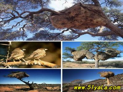 喜欢群居的织布鸟是空中最友善的飞鸟。它们可以团结起来,在一整棵树上建造一种和“公寓大楼”一样的了不起的建筑。300对织布鸟一起努力,建造这个由许多独立巢穴构成的巨大鸟巢,最大直径可达25英尺宽,高5英尺。最后,每对织布鸟伴侣都分到一个房间。就和一座庞大的公寓楼一样,织布鸟建筑有各种各样通往房间的“地下室”入口。