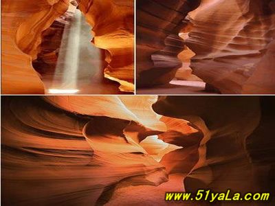 羚羊峡谷位于美国亚利桑那州的最北部,距离小城佩奇大约三十公里,是北美印地安人最大部落纳瓦霍人的属地。这里过去是野羚羊的栖息处,因峡谷里常有野羚羊出没而得名。峡谷总长约400多米,谷顶两侧的距离很窄,但由谷顶到谷底的垂直距离却高达十数米。狭缝型峡谷分为两个独立的部分,也就是上,下羚羊峡谷。上羚羊峡谷亦称“裂纹” 而下羚羊峡谷则称作“螺旋” 。光线完全是自然光通过不同深度的红色岩层缝隙的折射射入洞内的,因此光线时刻在变化,一年四季,甚至每天不同的时间,不同的角度看到的色彩都不同,置身其中,真似进入了一个五彩缤纷魔幻世界,令人终身难忘。