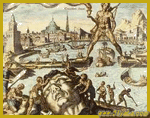 马其顿侵略者德米特里带领四万军队(这已超过了整个岛上的人口)包围了港口。经过艰苦的战争,罗德岛人击败了侵略者。为了庆祝这次胜利,他们决定用敌人遗弃的青铜兵器修建一座雕像。雕像修筑了十二年,它有110英尺高,也就是说,和大家熟知的纽约自由神像的高度差不多。雕像是中空的,里面用复杂的石头和铁的支柱加固。但这个伟大的雕像建成仅仅56年后就被强烈地震毁坏了。似乎与传说中的雕像有出入。传说中雕像两腿分开站在港口上,船只是从腿中间过去。想象一下那是多么壮观而有趣的场景啊。
