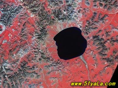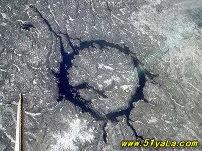 加拿大曼尼古根陨坑又被称为“魁北克之眼”,它是地球上最古老的碰撞陨坑,大约已有2亿年的历史。在陨坑边缘有70公里长的水力发电水库。在陨坑中心的小岛是陨星碰撞之后形成的岛屿隆起。在这张照片中,从航天飞机侧翼处可以清晰地观测到陨坑底部状况。