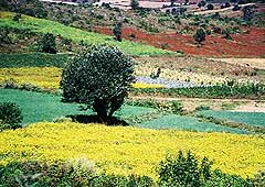 从蒲甘往茵莱湖的高山崎路上,一片大好的田野风光,大黄芝麻花漫山遍野,与蔚蓝的天空配成绝佳的明信片。是收割的季节,麦地里的人群还是忙中偷闲,在高山上燃火煮茶、聊天。
