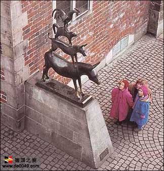 不来梅的乐队铜像(Musikanten),取材于童话《不来梅的音乐队》。是说驴、狗、猫、鸡来到不来梅全成了音乐师的故事。铜像作者是盖尔哈特·马克斯。