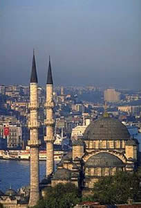 出门时,门口的老人告诉我,这座清真寺建于1597~1663年间,只是伊斯坦布尔众多的著名清真寺中的一座。老人指着不远处的一座豪华清真寺对我说,那是苏莱曼一世的清真寺,由建筑师史纳恩1550~1557年间设计建造,被认为是伊斯坦布尔所有帝王清真寺中最漂亮的,苏莱曼和妻子胡月曼·苏丹都葬在里面。我去那里参观时,果然见到在一处有专人守卫的豪华厅堂里供奉着苏莱曼一世和他妻子的灵柩。这个清真寺坐落在山丘上,加上它的结构庞大,又有4个高耸的尖塔烘托,使之格外引人注目,远远望去,确实宏伟壮观。