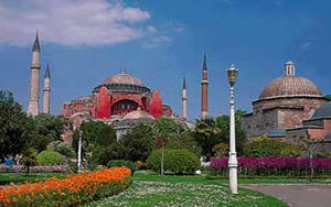 当你走进阿亚索菲亚教堂这座宏伟的大厦时,不能不惊叹人类的智慧有多么高超。这座长方形的古代罗马天主教建筑由康斯坦丁大帝建造,于公元6世纪建成,又名圣索菲亚。它宽大的圆顶直径达31米,离地面55米,还装饰了漂亮的拜占庭马赛克。这里现已辟为博物馆。在古代科技尚不发达的条件下,建造如此大跨度的拱顶不能不说是一个奇迹。像这样的基督教建筑还有圣·厄热勒和卡里耶,如今也辟为博物馆。特别是后者,名气更大。它是继圣索菲亚教堂之后,伊斯坦布尔最主要的拜占庭建筑。它的墙面用华丽的壁画和烫金的马赛克装饰。据说这种装饰对欧洲的文艺复兴运动都产生过影响。