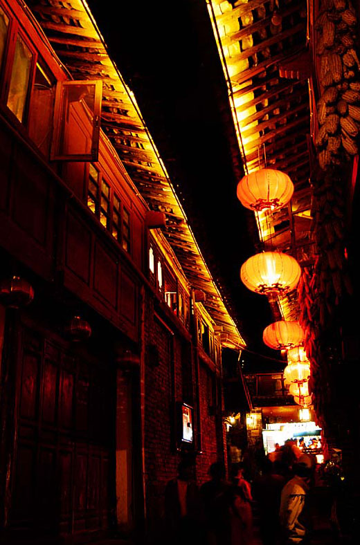 在这样的欢笑声中,在我们都真实地感到对丽江的憧憬已然变成深深爱恋的时候,丽江呈现在眼前。我没料到她竟是一个颇具规模的繁华市镇:灯火通明的酒店、熙熙攘攘的行人、到晚上9点仍然营业的店铺,以及弥漫在大街小巷的爆竹燃放后留下的硝烟。