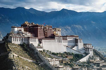 布达拉宫,屹立在海拔3700多米的高山上,是地球上最高最完整的古建筑群。主体建筑分白宫和红宫两大部分,整个建筑依山势和阳光规律设计,整体结构相互关联。在屋顶、楼层和底面均用“阿嘎土”打平;宫内雕梁画柱,充满壁画;宫顶以不同形状的金顶等装饰,使布达拉宫成为一座艺术宝库。