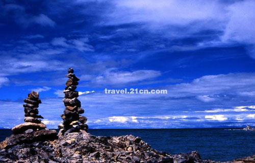 十二点,我们才见到了心仪许久的圣湖----纳木错。以前看她的照片,都是极明朗的天气里的倩影,那种蓝天映衬之下的纯净的湖水,呈现不同层次的蓝色的美丽。可惜,天公不作美,与我们拥抱的天湖是蒙蒙细雨下的一个模糊的影子。依旧是一个美丽的女子,却好象很羞涩的用丝巾遮住面容,只留给我们想象的空间。念青唐古拉山是她的情人,还是她的丈夫,他们就这样相依相伴,经历了世事沧桑,人生轮回。不变的是,他们深深的恋情,对彼此的无法割舍的牵挂,所以他们选择长相厮守,留在这不易发现的天边,保留最后的一份纯洁和寂静。我和爱人漫步在寒冷的湖水边,感受心灵的洗礼。我们承诺,自己的爱情也能象纳木错和念唐古拉山一样万古长青,永远纯洁。