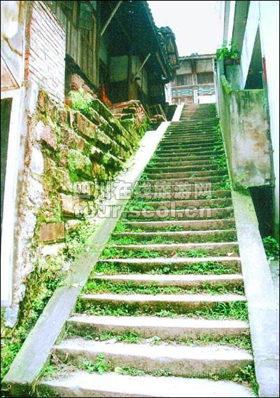 小镇只有一条街道,由红褐色石板铺筑,顺山势蜿蜒,不过500米长,宽阔处近3米,狭窄处只有1米多。小镇建筑最大的特色是吊脚楼,临河一面几乎全悬于半空,自成一道古色古香的风景,令许多前来考察的学者和摄影师们惊叹。小镇坐落在小凉山马边彝族自治县正东30公里处,名叫荞坝。
