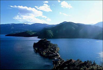 当我静静地躺在湖水里漫思、用心地享受着大自然的恩赐的时候,我的那三个游伴也无法再拒绝泸沽湖那像清纯摩梭少女一样的柔情,也抛下了他们绅士的风度纷纷跳进了水中。在这宛若隔世一般的湖水中,我们像一群天真烂漫的孩子一样欢笑着,游嬉着……