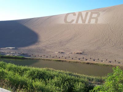 位于敦煌市西南5公里处,是一处神奇的沙漠奇观。沙丘因人登之即鸣,泉山形成一湖,在沙丘环抱之中,酷似一湾新月而得名。