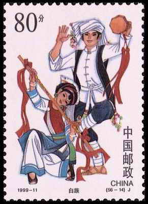 白族男女都崇尚白色,以白色为尊贵。大理地区的男子多穿白色对襟衣,外套黑领褂,或数件皮质、绸缎领褂,俗称“三滴水”,腰系皮带或绣花兜肚,下着蓝色或黑色长裤。在云南洱源县西山区,每个成年后的白族男子都身挎一个小巧玲珑的绣花荷包,荷包上绣着“双雀登枝”、“鸳鸯戏水” 等字样。绣荷包是爱情的象征,它是白族姑娘聪明智慧的结晶。