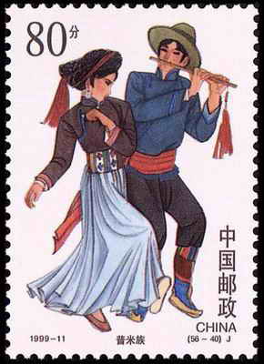 按古老的习俗,普米族儿童只能穿长袍大褂,13岁以后才改穿衣裤、衣裙式短装;成年男女无论衣式如何,均外着羊皮坎肩或披肩,系腰带;妇女还以发辫粗大为美,喜欢用牦牛毛和黑丝线编入发辫之中,盘于头顶;宁蒗地区的普米族妇女多穿束腰、多褶的长裙,在裙子的中间,通常都横绣一道红色彩线。她们说这是祖先迁移的路线,人死了以后需沿这条路去寻找自己的归宿,否则就回不了老家。