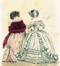 1840年的婚礼服 大胆的低领口,上半身V字嵌入下半身的大裙。特有的发型表现了怀旧情绪和对异国情调的猎奇心理。
