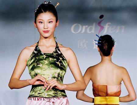 8月20日,模特在演绎一款绣花肚兜内衣。当日,欧迪芬国际集团在上海举办“中国内衣文化展”。模特展示了汉、唐、宋、元、明、清六朝多款内衣。