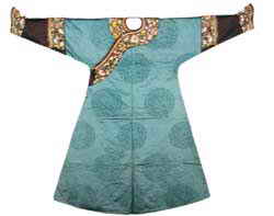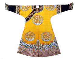 龙袍是一般节日穿的。明黄色.右袵,箭袖,两开裾。袖为石青色。袖端正龙各一,袖相接处行龙各二。衣纹与龙褂相同。领圈前后正龙各一,左右交襟行龙各一。领后垂明黄绦,饰有珠宝。这件明黄色缂丝五彩云金龙八团龙袍,乾隆年制。仅缂丝就要用一千余工。皇后还有一种五彩云九金龙的龙袍。皇太后、皇贵妃龙袍与皇后相同。贵妃、妃龙袍金黄色,嫔香色,领后皆垂金黄绦,饰以杂宝。