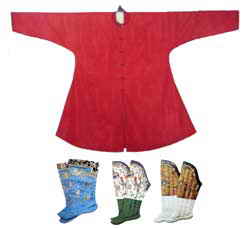 清代一般穿布做的袜子。这些是皇帝用的绸缎绣花袜子,是秋、冬穿的。其质地和纹饰随意选用。