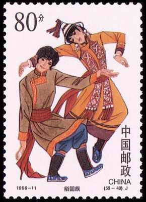 裕固族妇女的头饰颇富有民族特色。当姑娘到了15岁时,要戴“萨达尔格”,意味着姑娘长大成人,可以婚配了。“萨达尔格”是在用红布做成的一块方形布牌上,缀以贝壳和各色珊瑚而成。