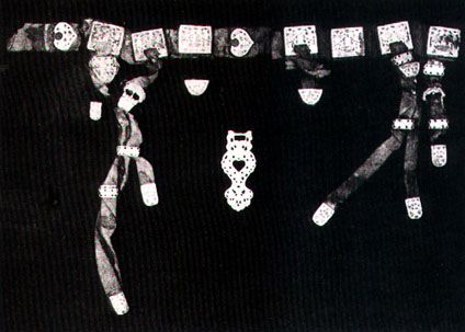 辽代南班服饰 辽代称汉族服装为“汉服”,也称“南班服饰”。它与契丹族的“国服”(或称“北班服饰”)有所不同。这种服饰不仅百姓可穿,汉族的官吏也同样可以穿。腰带有蹀躞带,本为胡制。带间有环,用作佩挂各种随身应用的物件,如弓、箭、算囊、刀、砺石等之类。在其它民族也有用蹀躞带的。此图为金饰蹀躞带(辽宁辽墓出土实物)。