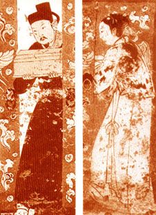辽代南班服饰 1971年在河北张家口市宣化区下八村里发现的辽墓,是一座汉族男子的墓葬。墓主是一个辽王朝的官吏。在他的陵寝四周的墙壁上,画满了各色人物,大多为汉族装束:男子或束发髻,或戴幞头,通穿圆领长袍;妇女梳髻,髻上插有发饰,耳垂挂有耳饰,身穿窄袖短襦,下穿曳地长裙,在腰的左侧,还垂有一条绶带,带上打有一结。据记载这种服饰,在辽代被称为“汉服”,也称“南班服饰”。它与契丹族的“国服”(或称“北班服饰”)有所不同。这种服饰不仅百姓可穿,汉族的官吏也同样可以穿。本图为戴幞头、穿袍服的汉族男子(河北出土壁画)及梳髻、穿襦裙的汉族妇女(河北出土壁画)。