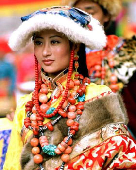 云南迪庆藏族聚居区,流行装束是内着袖茧绸衬衣,外罩呢绒坎肩。坎肩图案大方,镶云头金银线绒饰边,以红珊瑚为衣扣,不用高领而以大银环公母扣挂于领口;下着曳地百褶裙,腰缠毛织百花带;喜欢佩戴金银镶珊瑚的长耳环,胸挂银质护身佛盒,右襟挂三须链;头发用彩色丝绦绳相编于头顶。