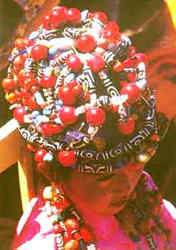 在藏北,已婚的女子将一头飘逸的长发中分,两边编成许许多多细长的辫子,前额的分发处,分别在两边的一根细辫上串上珊瑚、翡翠之类的宝石,后脑勺编一根较粗的发辫,上面缀满了大大小小的银圆,样子蛮好看。做这样的发型是很费时费力的,在冬季它常淹没于狐皮帽、羔皮帽、头巾之类底下,若隐若现。 在藏北,狐狸皮帽子是礼帽。嫁娶新娘、赴宴或举行盛会什么的,那是必戴不少的。