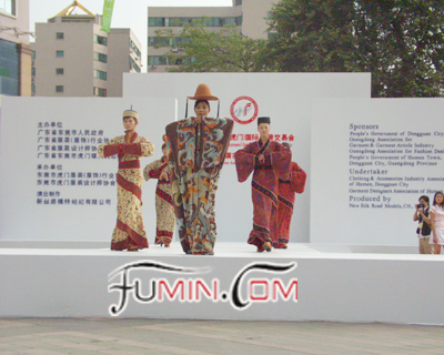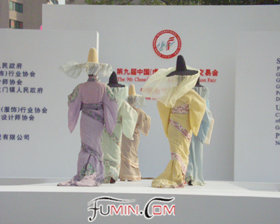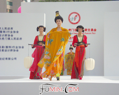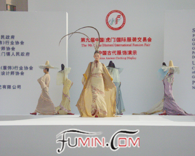 本网现场报道 2004年11月12日上午9:00以一场精彩的中国古代服饰表演凑响了第九届中国(虎门)国际服装交易会的开幕序曲。本场服装秀由来自新丝路的李冰、肖青、李子宁等知名模特演出,展示了中国古代特别是唐朝时期华美大气、高贵、典雅的服饰。同时还秀出了中国民族服饰,一场生动精彩的表演令在场众无不为之振撼、倾叹!(夏惠珍)