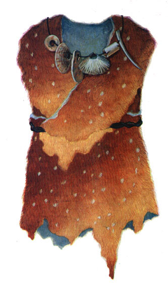 根据出土的骨针、骨锥等制衣工具想象复原的。在纺织技术尚未发明之前,动物的毛皮是人们服装的主要材料。当时还没有绳、线,可能用动物韧带来缝制衣服。在山顶洞人的遗址及其它古墓里,层发掘出大量的装饰物,其中有头饰、颈饰和腕饰等,材料有天然美石、兽齿鱼骨和海里的贝壳等,当时佩戴这些饰物,可能不仅是为了装饰,也许还包含着对渔猎胜利的纪念。