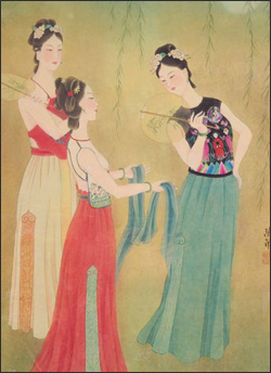 以“凤”纹来作为名门闺秀的化身,是内衣装饰语汇中的常用手法,肚兜上命官与两妻妾的对称左右,是权贵家族的形象体现,绣法上用晕色工艺,色彩繁纷并层次丰厚。