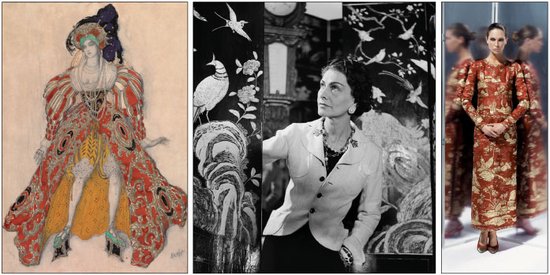 右:Karl Lagerfeld设计的1996年香奈儿秋冬高级定制服系列中“中国乌木漆面屏风”长礼服