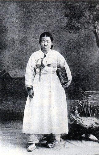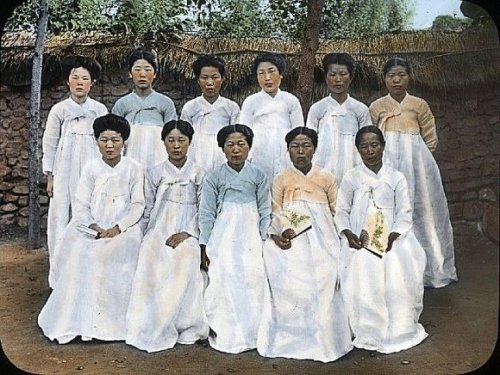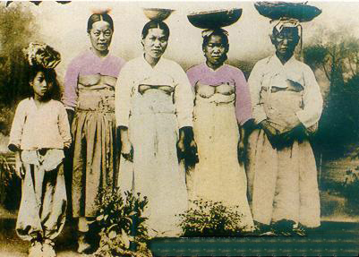 日本侵略朝鲜后,觉得朝鲜妇女的衣着有伤风化,强令妇女遮住胸部,于是,进化成下面这样