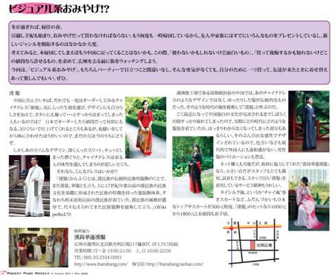 今年2月,石川小姐对汉尚华莲和叶迢若进行了正式的采访,报道刊登在了日本《Pocket Page》周刊2011年3月第一期的“中国生活情报”版块。其中介绍了汉服概念、汉服的价位等,并对这家汉服实体店进行了介绍。据了解,“汉尚华莲”是目前广州最大的一家汉服实体店,成立于2008年,现位于广州繁华的商业地段北京路。2010年,广东省电视台《走出地铁》栏目组曾对“汉尚华莲”进行了专题报道。据该日本杂志介绍,该汉服商家的汉服价格在300-1800元不等,普通的在300元左右,而专门定制汉服则需要数千乃至更高。
