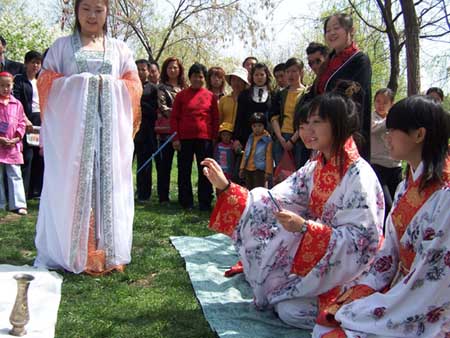 “三月三日天气新,长安水边多丽人。”这一切于4月22(农历三月初六)日上午10时30分在小西湖公园湖水边重演了:一群美丽的女子,身穿汉民族服饰,补过“上巳女儿节”(农历三月初三)。游人好奇的目光投向了这群身着“奇装异服”的女孩子,亲眼目睹了发生在现实生活中的传统女儿节礼仪和“投壶”游戏(古代宴饮时的一种游戏)。