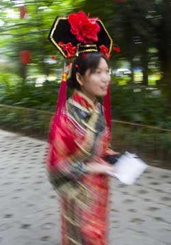 一向重礼仪的中国的服务小姐穿上旗袍迎宾待客当然不能说是种错误,人们产生“不伦不类”的情绪也难免,有人说,“这是对传统的践踏。”这话或嫌偏激,但旗袍这一国服的传统意味在削减却是真的。被当作闲暇时装的旗袍与只作为民族象征及盛典着装的国服同时并存,这也许是目前大众既怀旧又力图摒弃传统的着装观念的一种表现。