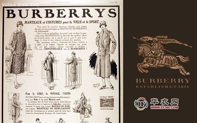 1901年,Burberry设计的雨衣,在第一次大战,被指定为英国军队的高级军服样式。同时他也创立了品牌的骑士标志,并注册为商业标志。时至今日,翻开英国牛津辞典,Burberry已成为风衣的另一代名词。