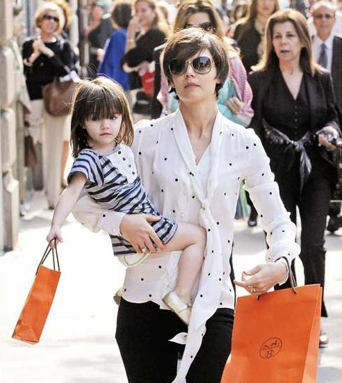 汤姆·克鲁斯现任妻子凯蒂·赫尔姆斯和女儿手里拎的就是售价八千人民币,由丝绸和小牛皮手工制作的Hermes环保购物袋。