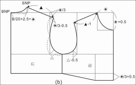 6、在袖笼深线上取(B/2+7cm)/3+0、7cm作前胸宽线,在前胸宽线上取◎/3+1cm,连接SNP作前肩线,使前肩宽=后肩宽-1cm,画顺前袖窿弧线。
