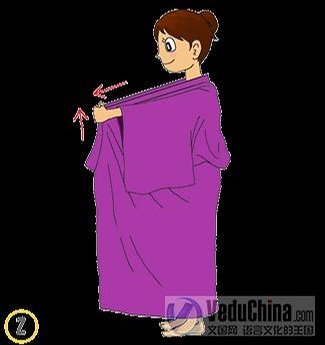 3、合上上前襟(左手的)。上前襟的边放在锁骨处。这时,将下前襟拉向前方,在腰部不要留出多余